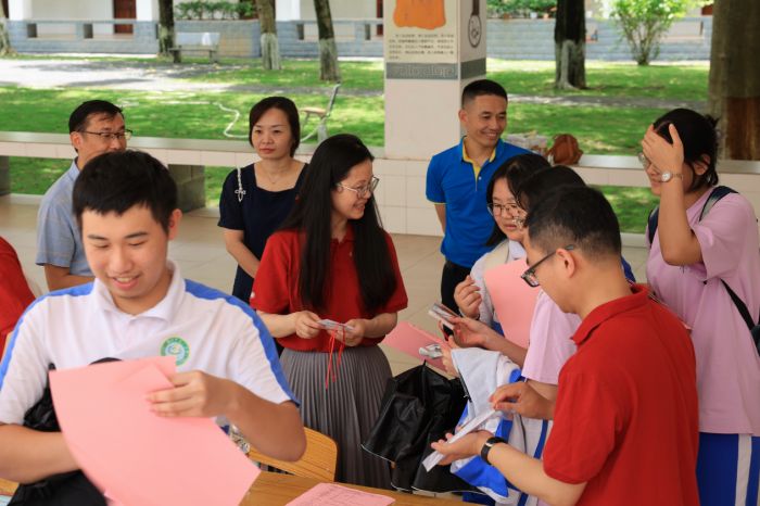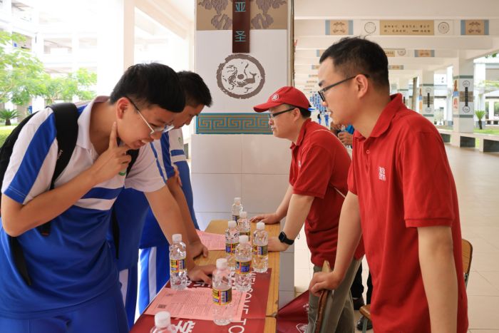 在海口第一中学,招生组在牛指成副校长、郑若蕊老师和校友会的帮助下,在校内设立咨询台,向高三学生发放详细的报考资料,并耐心解答同学们的提问。