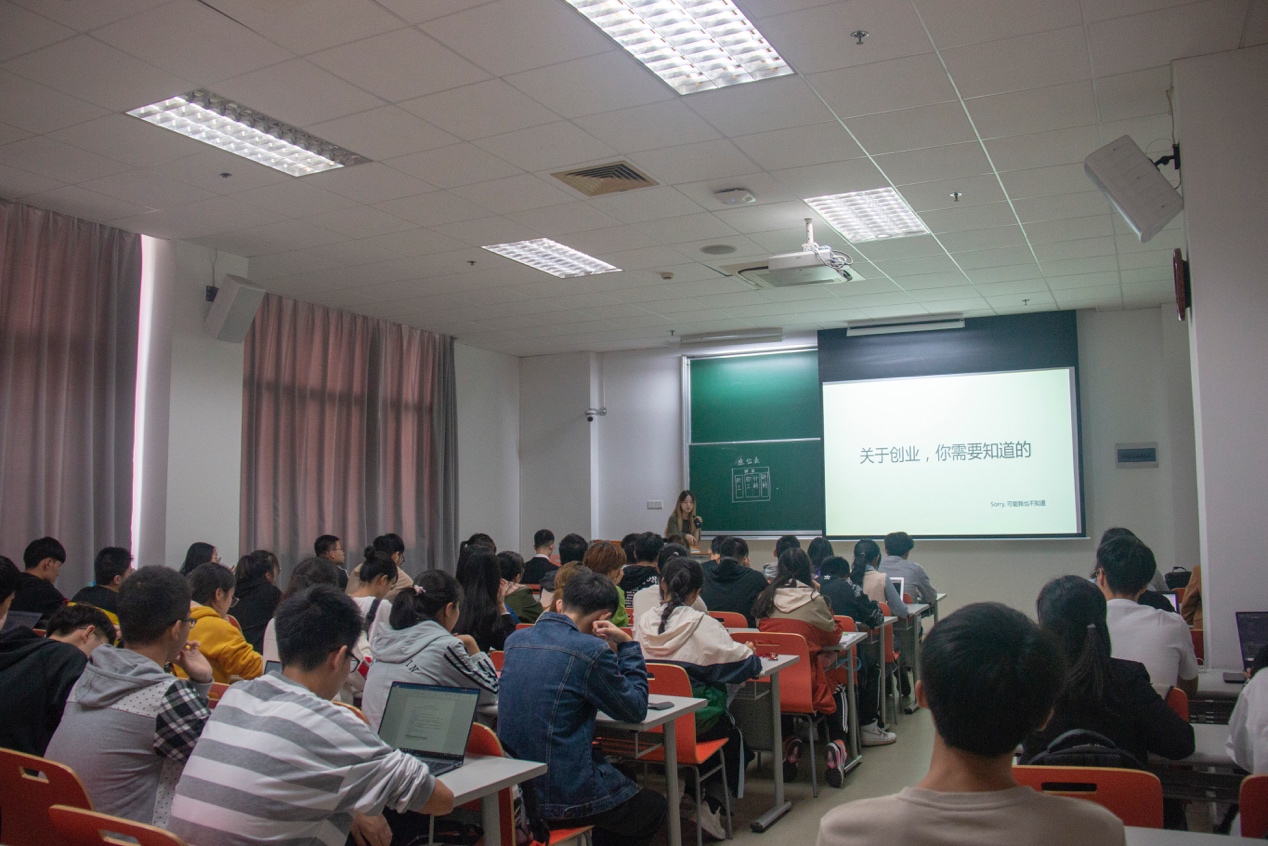 首先是上海光潾网络科技有限公司的阮昕为大家分享创业经历和经验。她用自己的成功创业经历告诉大家:如果想要创业,目标明确很重要。在大学期间就要明确自己毕业后是要创业还是继续深造,切不可模棱两可,在犹豫中浪费宝贵时间。她还指出:如果在大学期间就想要自己创业,项目经验和实习经历是必不可少的。阮昕的经验分享让同学们对就业和创业的认识更加明晰,也让大家体会到了创业者的不易。