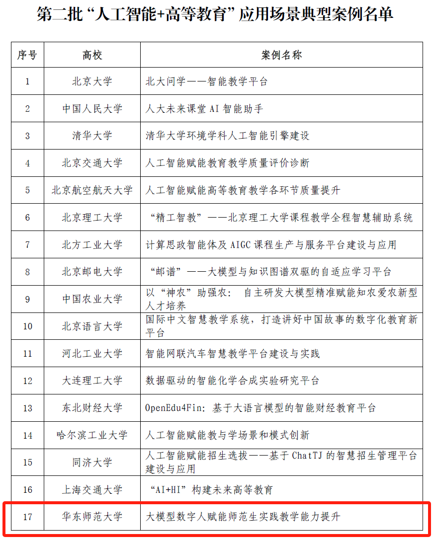 教育部近日发布通知,公布第二批32个“人工智能+高等教育”应用场景典型案例,华东师范大学的“大模型数字人赋能师范生实践教学能力提升”成功入选。
