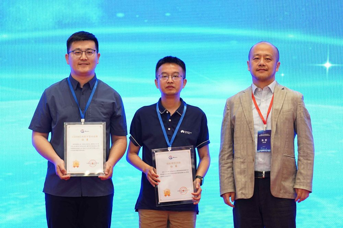 成果代表王祥丰、周文礼(左一/二)于第四届“数学促进企业创新发展论坛”领奖