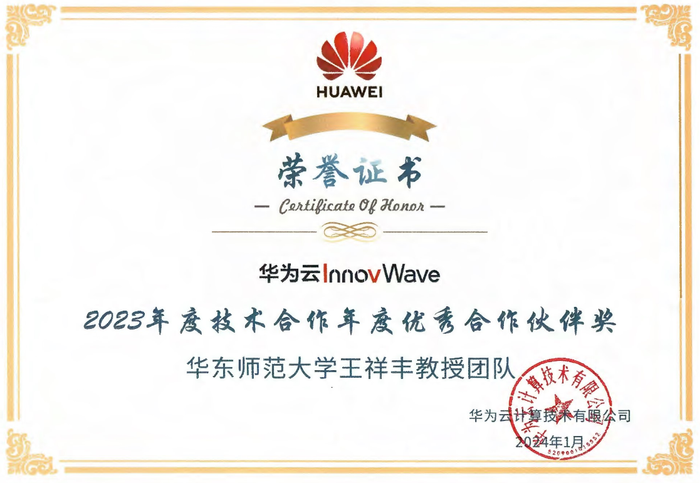 -在云计算资源自适应容量规划方法方面,通过引入虚拟集群概念及“重规划”思想, 提出以至少资源浪费为目标的容量规划效率度量指标,创新性提出了基于学习优化的自适应“重规划”框架方案。该框架已整合入华为云“瑶光”云计算系统架构,通过自适应容量规划子模块增强云计算资源调度效率和稳定性。王祥丰教授承担的“公有云场景下计算资源池容量规划技术研究”项目获得华为云2023年“十大优秀技术项目”,并荣获华为云2023年度“技术合作年度优秀合作伙伴奖”。