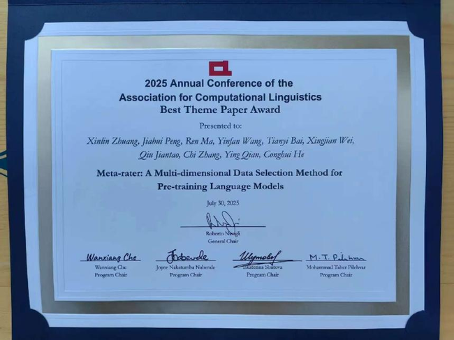 本届大会投稿量再创新高,共收到论文投稿8360篇,竞争空前激烈。主会论文接收率为20.3%,Findings论文接收率为16.7%。大会最终评选出4篇最佳论文、2篇最佳社会影响力论文、3篇最佳资源论文、3篇最佳主题论文、26篇杰出论文等重要奖项。庄薪霖同学的研究成果从数千篇高质量投稿中脱颖而出,荣获“最佳主题论文奖”,充分体现了其工作的创新性、系统性与广泛影响力。