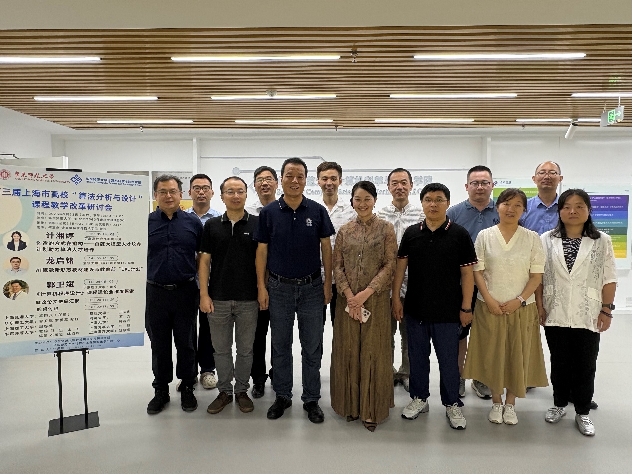 2025年9月13日下午,第三届上海市高校“算法分析与设计”课程教学改革研讨会在华东师范大学理科大楼B座504室和线上腾讯会议同步举行。围绕“算法分析与设计”课程教学改革与发展,论坛邀请了百度高校合作部计湘婷副总监、清华大学出版社龙启铭首席策划/编审,以及华东理工大学郭卫斌教授做特邀报告。华东师范大学本科生院实践教育办公室彭超主任、计算机科学与技术学院贺樑副院长、徐飞副院长出席了此次会议,本次研讨会由华东师范大学计算机科学与技术学院、华东师范大学计算机工程实验教学示范中心承办。计算机科学与技术学院何高奇教授负责组织、主持这次研讨会。来自上海交通大学、复旦大学、同济大学、华东师范大学、华东理工大学、上海大学、上海理工大学、上海海事大学、上海海洋大学等十所院校的三十余名师生参与了此次论坛。