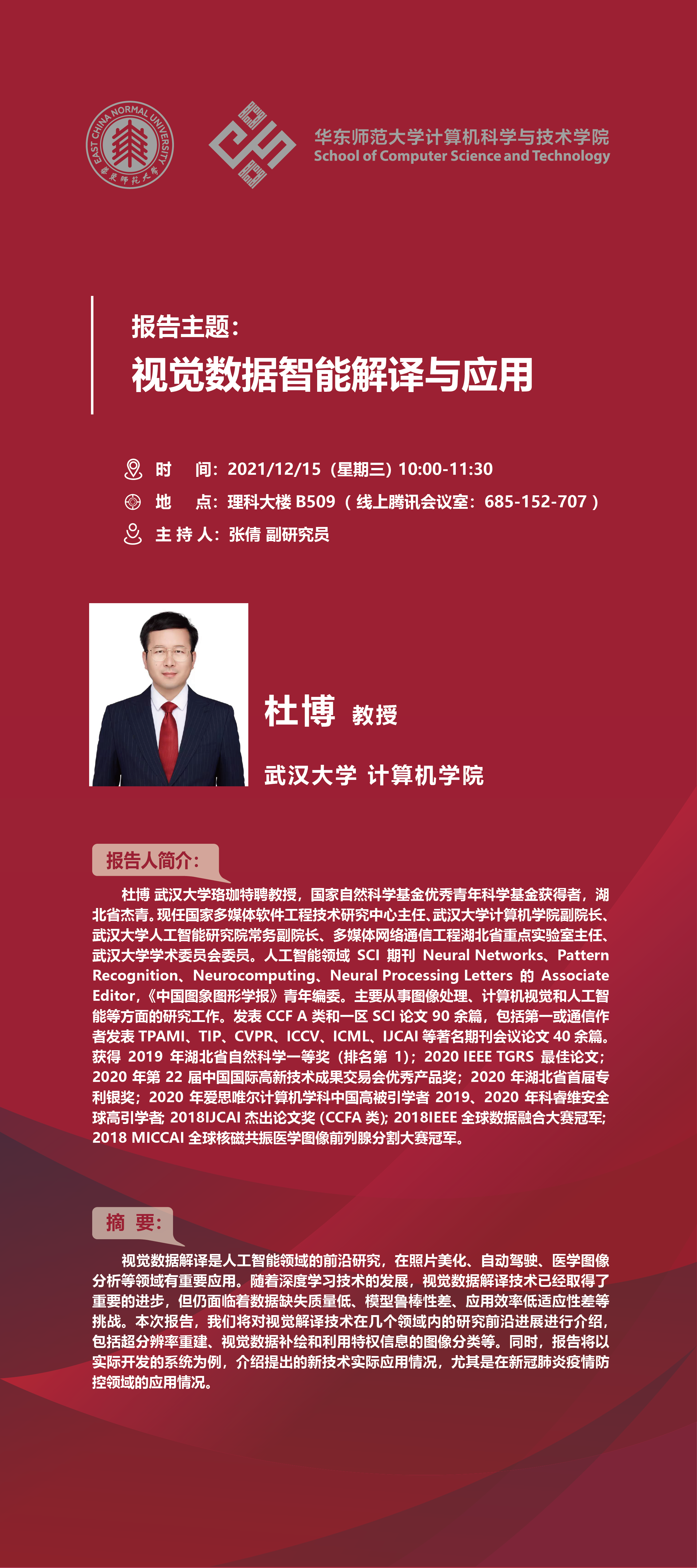 杜博,武汉大学珞珈特聘教授,国家自然科学基金优秀青年科学基金获得者,湖北省杰青。现任国家多媒体软件工程技术研究中心主任、武汉大学计算机学院副院长、武汉大学人工智能研究院常务副院长、多媒体网络通信工程湖北省重点实验室主任、武汉大学学术委员会委员。人工智能领域SCI期刊Neural Networks、Pattern Recognition、Neurocomputing、Neural Processing Letters的Associate Editor,《中国图象图形学报》青年编委。主要从事图像处理、计算机视觉和人工智能等方面的研究工作。发表CCF A类和一区SCI论文90余篇,包括第一或通信作者发表TPAMI、TIP、CVPR、ICCV、ICML、IJCAI等著名期刊会议论文40余篇。获得2019年湖北省自然科学一等奖(排名第1);2020 IEEE TGRS最佳论文;2020年第22届中国国际高新技术成果交易会优秀产品奖;2020年湖北省首届专利银奖;2020年爱思唯尔计算机学科中国高被引学者2019、2020年科睿维安全球高引学者;2018IJCAI杰出论文奖(CCFA类);2018IEEE全球数据融合大赛冠军;2018 MICCAI全球核磁共振医学图像前列腺分割大赛冠军。