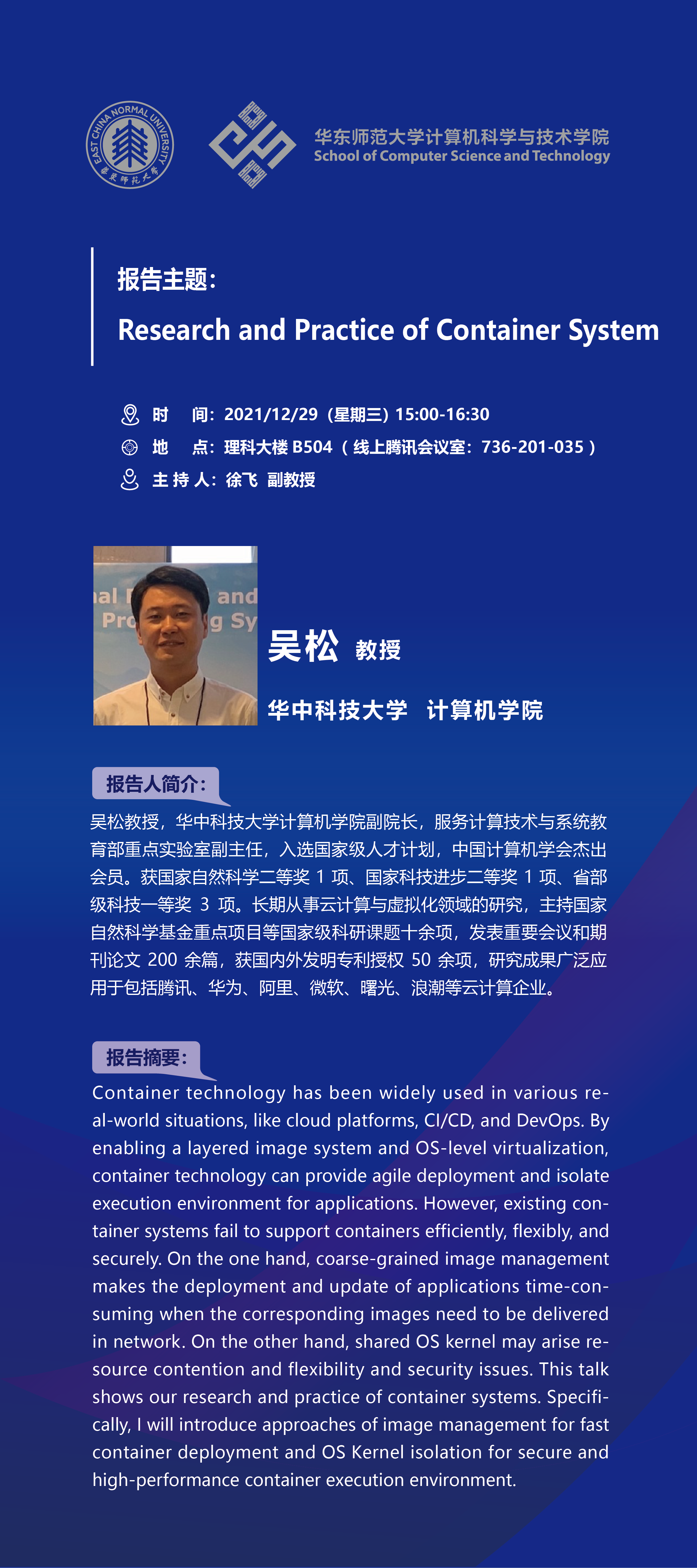 吴松教授,华中科技大学计算机学院副院长,服务计算技术与系统教育部重点实验室副主任,入选国家级人才计划,中国计算机学会杰出会员。获国家自然科学二等奖1项、国家科技进步二等奖1项、省部级科技一等奖3项。长期从事云计算与虚拟化领域的研究,主持国家自然科学基金重点项目等国家级科研课题十余项,发表重要会议和期刊论文200余篇,获国内外发明专利授权50余项,研究成果广泛应用于包括腾讯、华为、阿里、微软、曙光、浪潮等云计算企业。