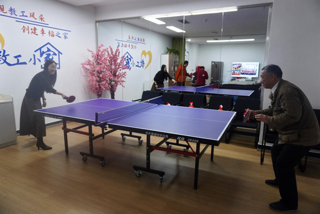 学院工会在教工小家安置了乒乓球桌、棋牌桌等休闲娱乐项目。还放置了沙发、按摩椅等供老师们休息。当天中午,学院老师纷纷来到教工小家休憩,品尝咖啡,畅聊新学期的规划和工作计划。期间,对乒乓球感兴趣的老师们进行了球技切磋,对下棋感兴趣的老师们则在现场以棋会友,相谈甚欢。小家气氛温暖而欢乐!